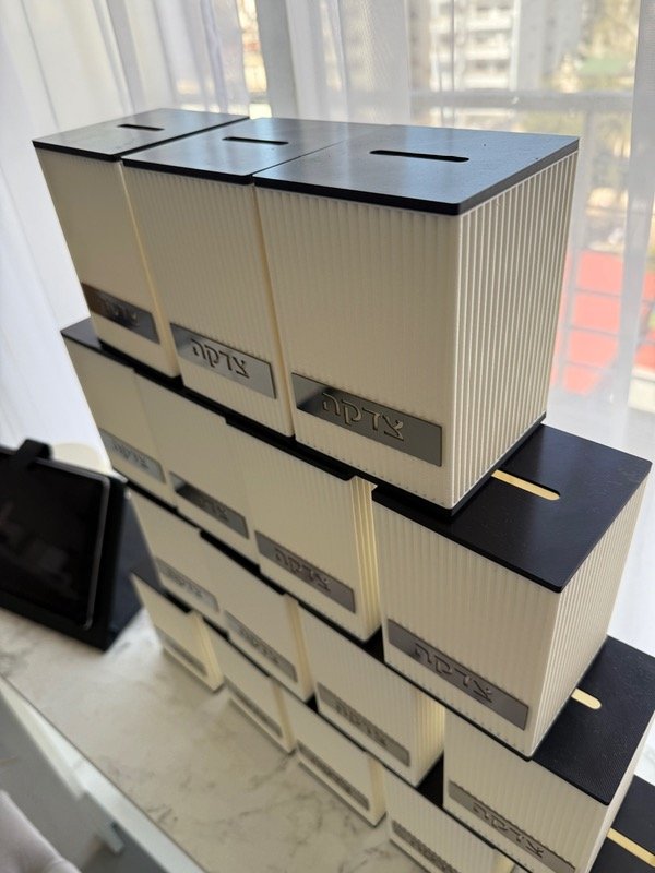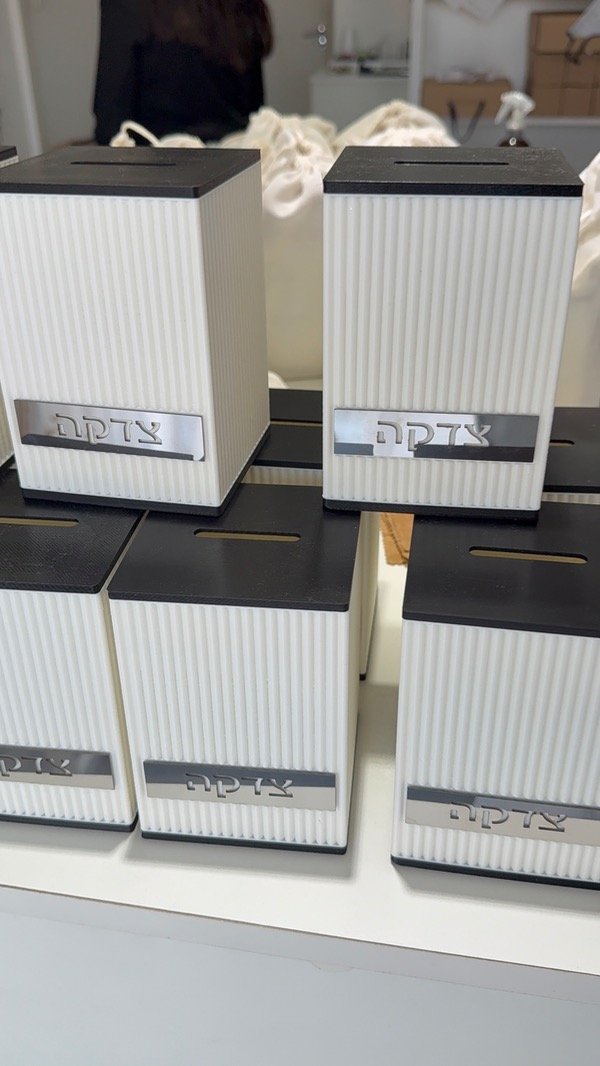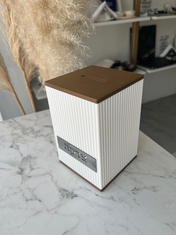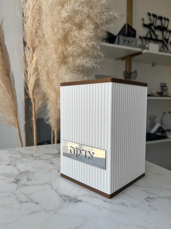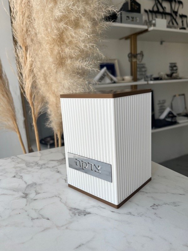 SUPER ELEGANTE Y MINIMALISTA alcancía para Tzedaka. En un delicado formato de polimero blanco y negro con textura acanalada decorado con enrejado en acero inoxidable espejado con TZEDAKA en hebreo.