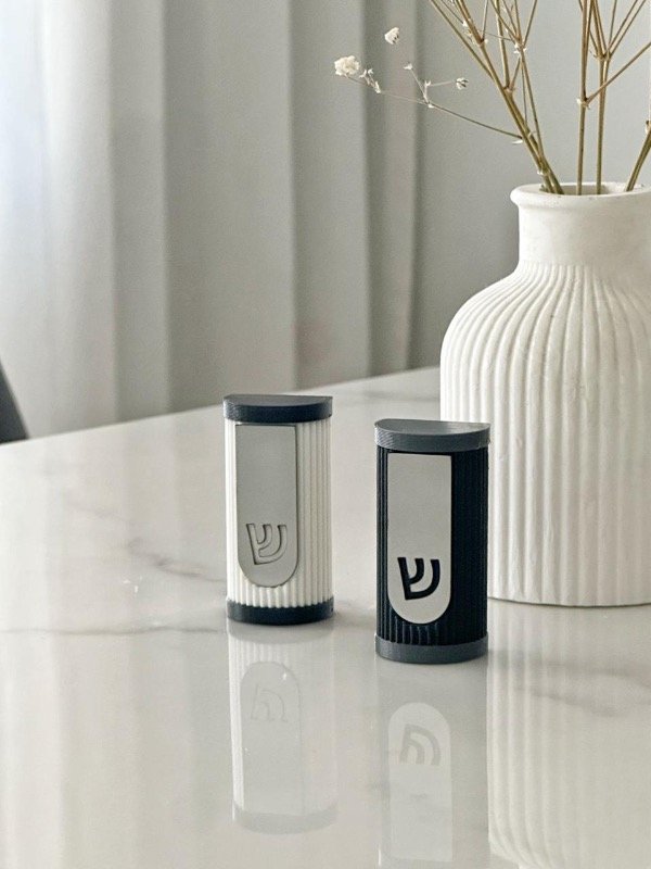 Diseño minimalista, textura acanalada, color blanca con extremos negros . Tapita a rosca en la parte inferior.