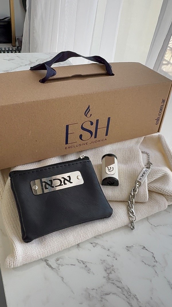 -Para organizar su guantera un mini pouch de cuerina con chapita en acero inoxidable espejado que dice ABA (papá)