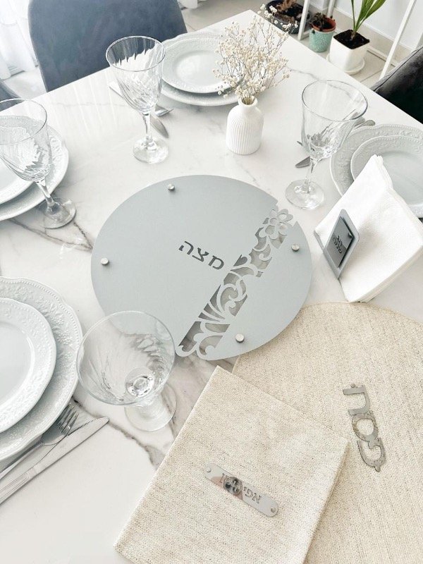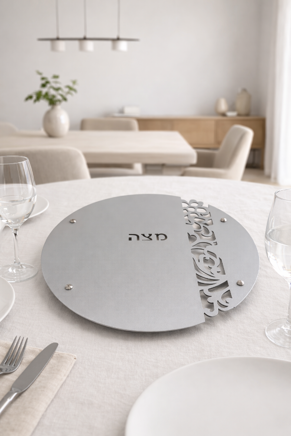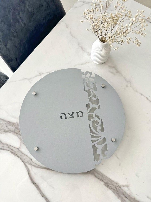 Bandeja gris glow para Matza redonda. Con patas en acero inoxidable y calado glam floral “Matza” en hebreo. Metal color negro.