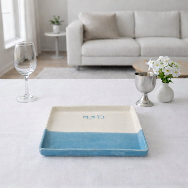Bandeja para matzá en cerámica, diseño minimalista y producción artesanal, donde el trabajo manual realza la pieza con trazas de arte. Un diseño que presenta en forma abstracta la apertura del mar en la mesa del seder. “Matza” en hivrit en calado de acero inoxidable espejado. 22x22cm