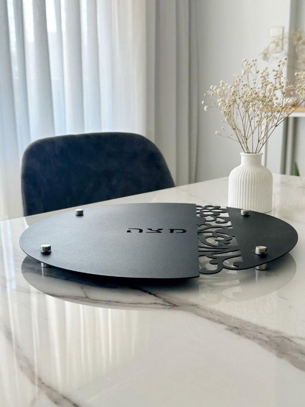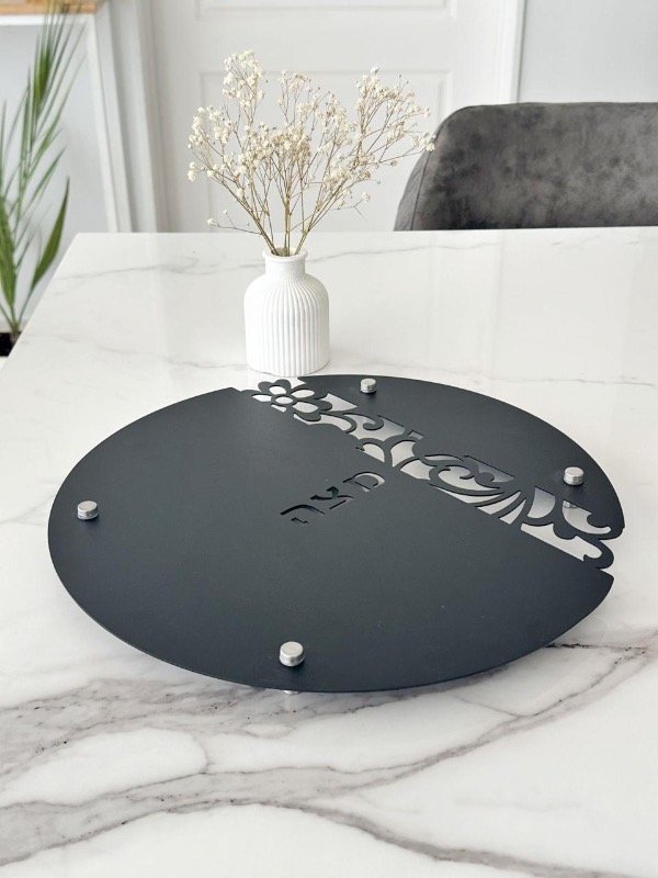 Bandeja negra para Matza redonda. Con patas en acero inoxidable y calado glam floral “Matza” en hebreo. Metal color negro.