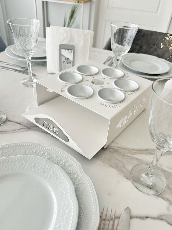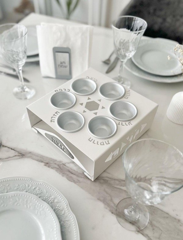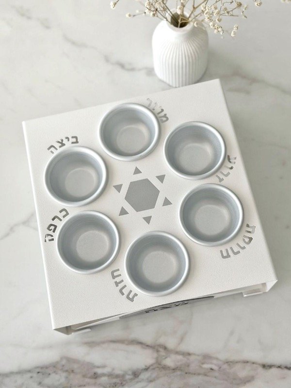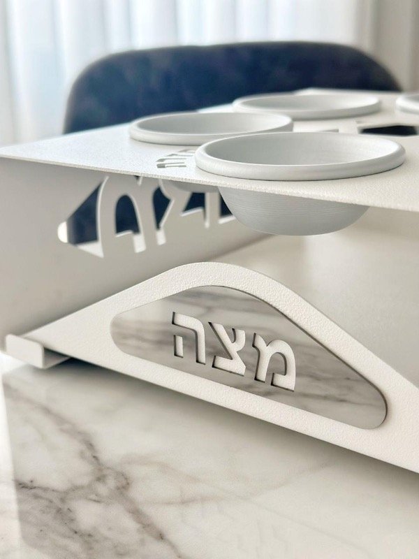 Keara súper versátil con bandeja extraible, podes usarla todo junto o separarlos en la mesa. Metal blanco, bowls aluminio anodizado, bandeja de metal con “matza” en acero inoxidable espejado, patas de felpa en Keara y bandeja.