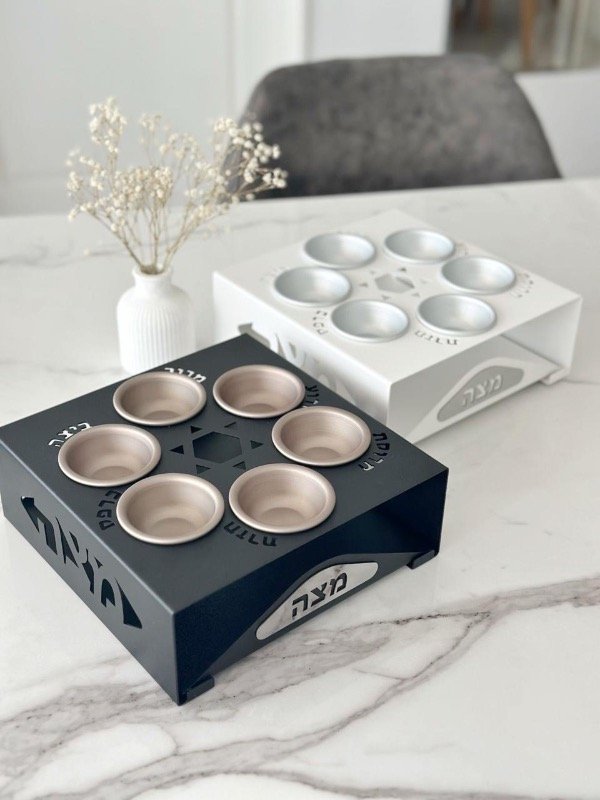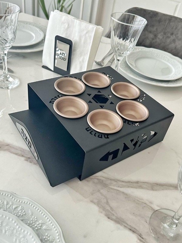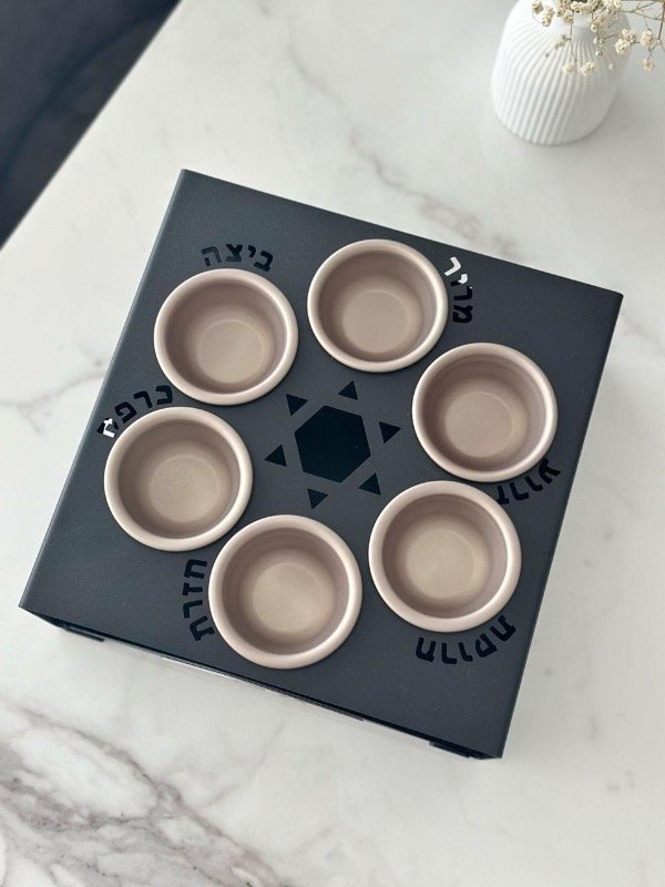 Keara súper versátil con bandeja extraible, podes usarla todo junto o separarlos en la mesa. Metal negro, bowls aluminio anodizado, bandeja de metal con “matza” en acero inoxidable espejado, patas de felpa en Keara y bandeja.