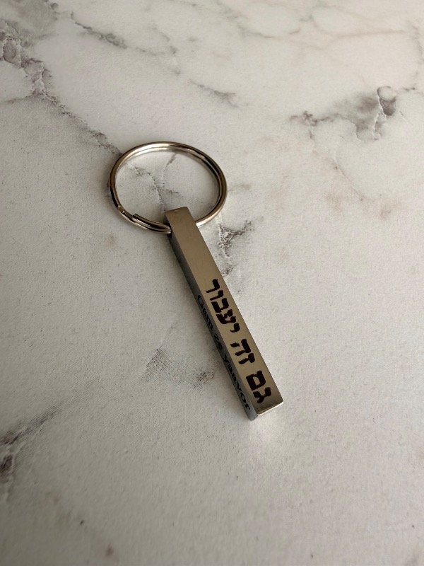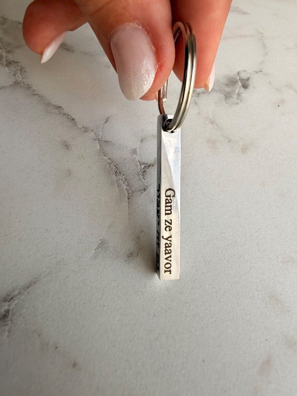 Llavero modelo lingote en acero quirúrgico plateado con con grabado GAM ZE YAABOR (2 caras en hebreo y 2 caras en fonética)