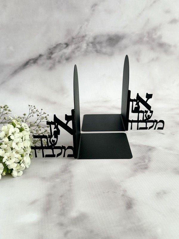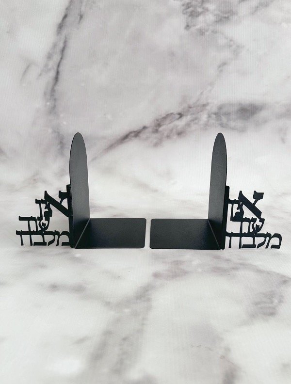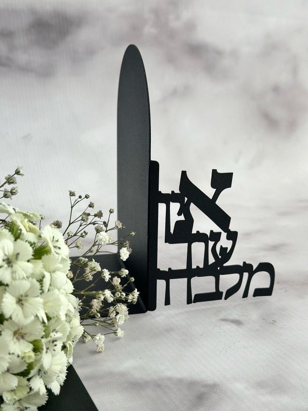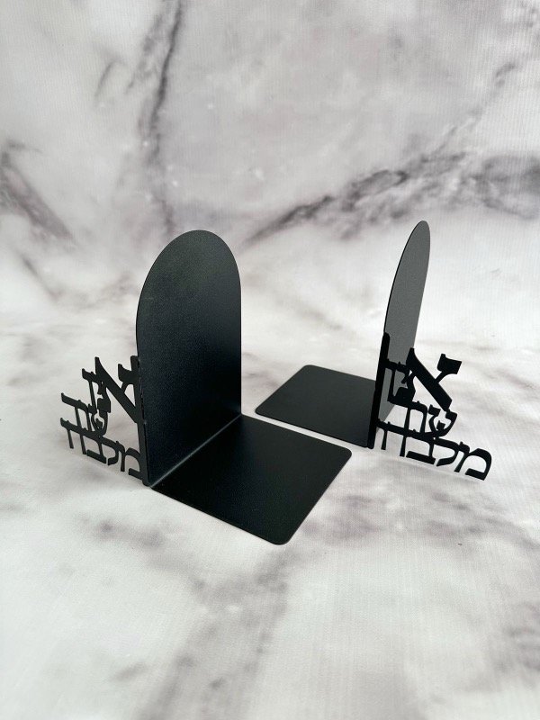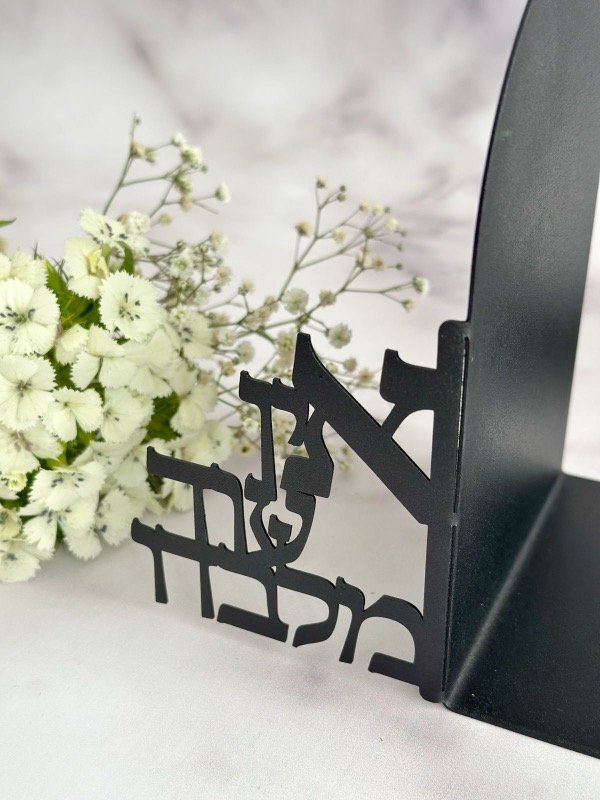 Par de sujeta libros para los extremos con frase EIN OD MILEVADO en hebreo, en metal negro ideal para tu biblioteca, estante o repisa. Con diseño decorativo y minimalista