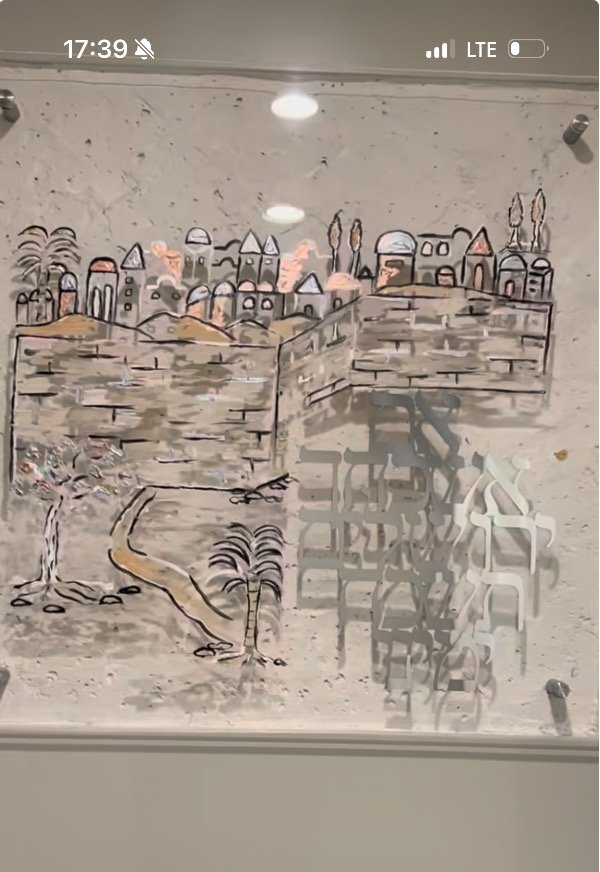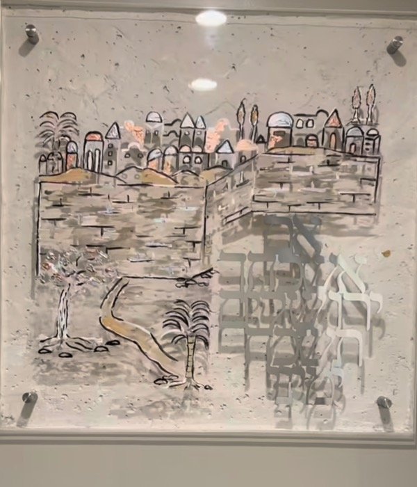 Cuadro calado "IM ESHKAJEJ IERUSHALAIM", en acero inoxidable espejado plateado en esquina inferior para dar espacio a la obra pintada a mano del kotel y ciudad de Yerushalaim, ensamblado en acrílico transparente. Viene en dos tamaños standard, que sirve para la mayoría de los casos: 50x50 y 60x60, se puede mandar a hacer ajustando al tamaño que necesites. En ese caso se debe cotizar. Incluye separadores de pared en acero inoxidable 2cm , tornillos y tarugos, no incluye instalación. Si el separador de pared se requiere en otra medida, queda a cargo del cliente.