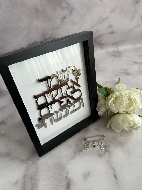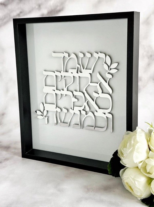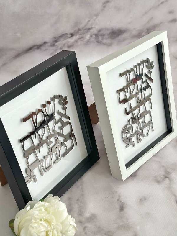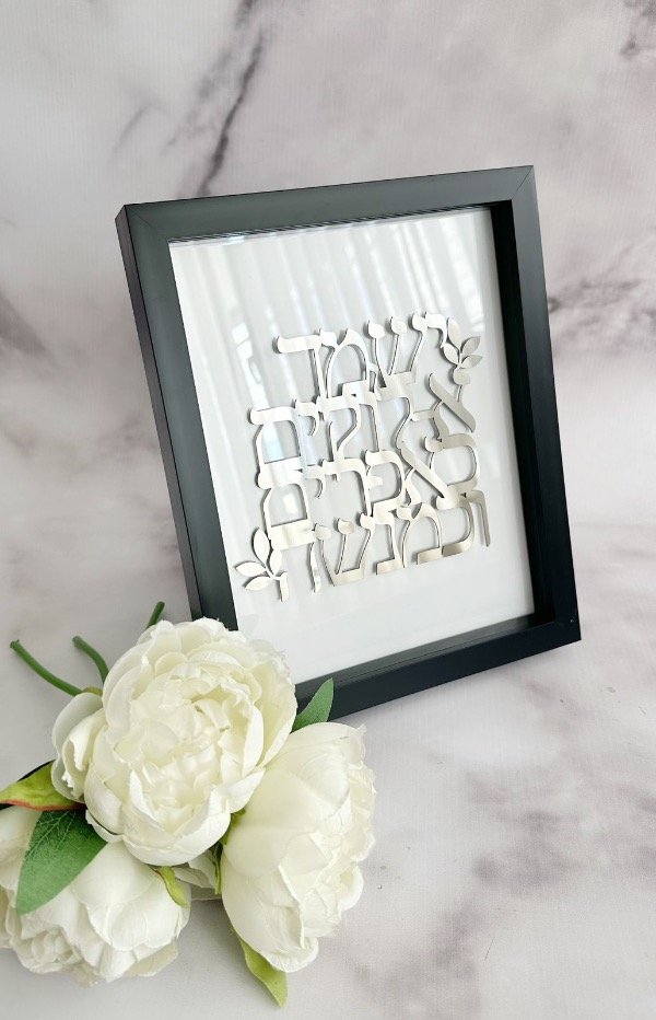 - Cuadro beraja para hijos varones enmarcado 20x25 cm blanco o negro como frase “IESIMEJA E-LOKIM KEFRAIM VEJIMENASHE” en acero inoxidable espejado. Modelo de marco según stock.