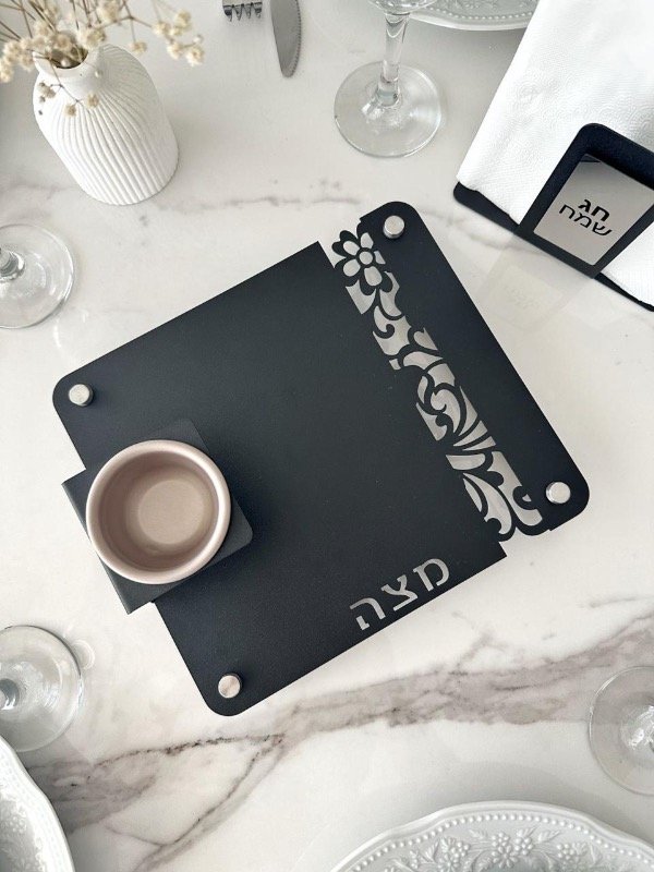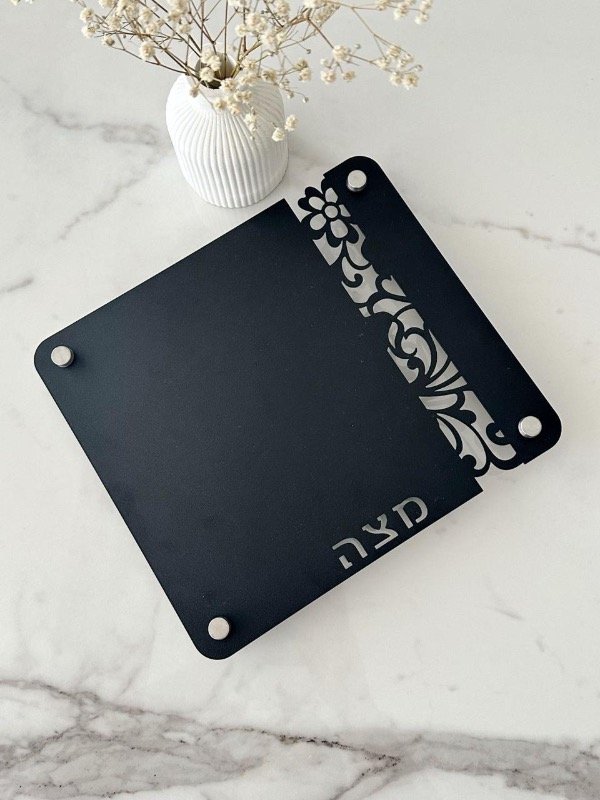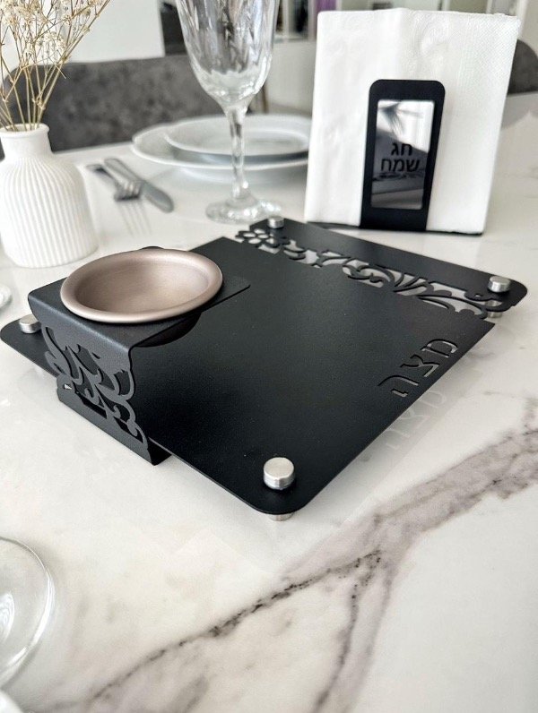 Hermosa bandeja para MATZA que se suma a nuestra línea Glam de diseño minimalista con guarda floral y calado “MATZA” en hebreo. En metal negro con patas en acero inoxidable plateado. Medidas aprox 22x24cm