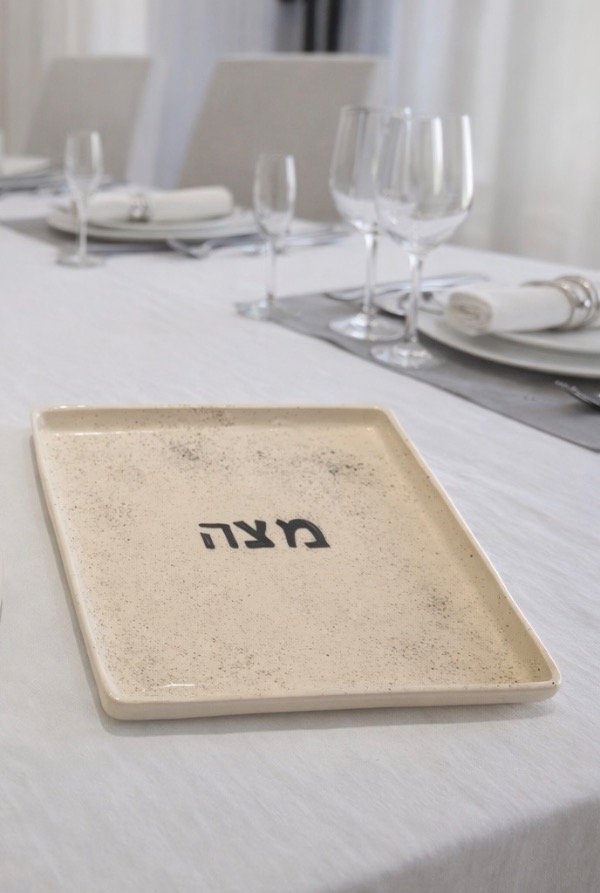 Bandeja para matzá en cerámica, diseño minimalista y producción artesanal, donde el trabajo manual realza la pieza con trazas de arte. “Matza” en hivrit en calado de acero inoxidable espejado. 22x22cm