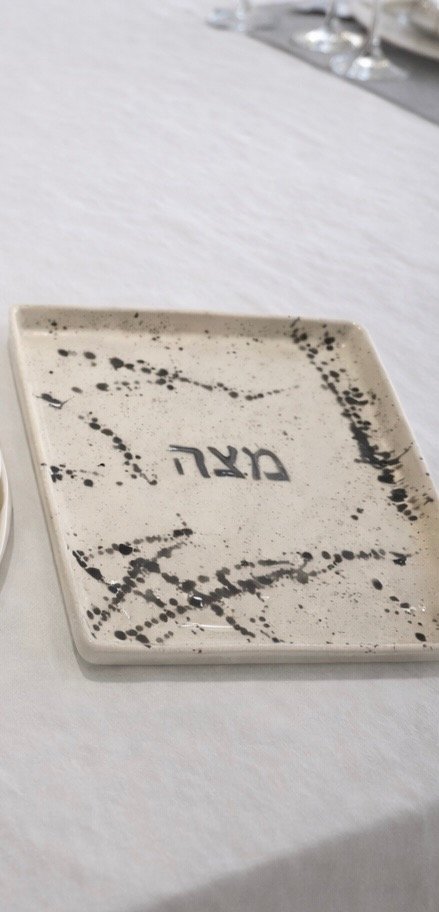 Bandeja para matzá en cerámica, diseño minimalista y producción artesanal, donde el trabajo manual realza la pieza con trazas de arte. “Matza” en hivrit escritos a mano. 22x22cm