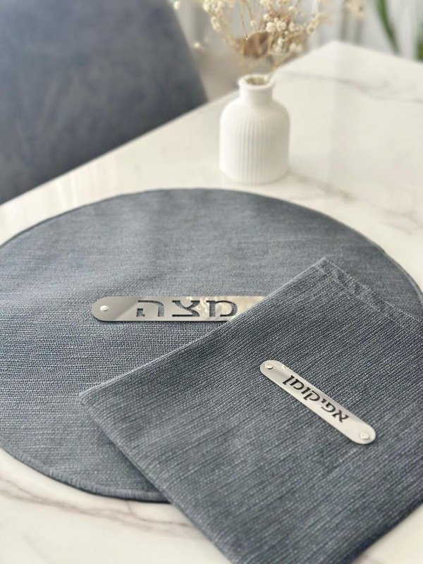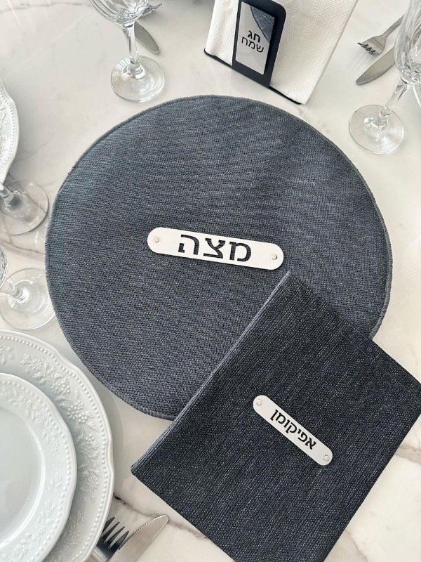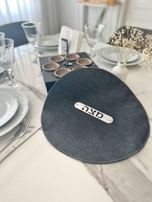 -Mapit redondo 38cm diámetro, cuerina textura símil lino color negro, dorso con 3 capas de Friselina blanca para separar las 3 matzot del seder, deco MATZA en acero inoxidable espejado