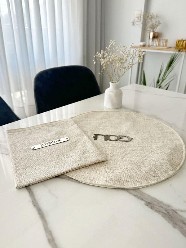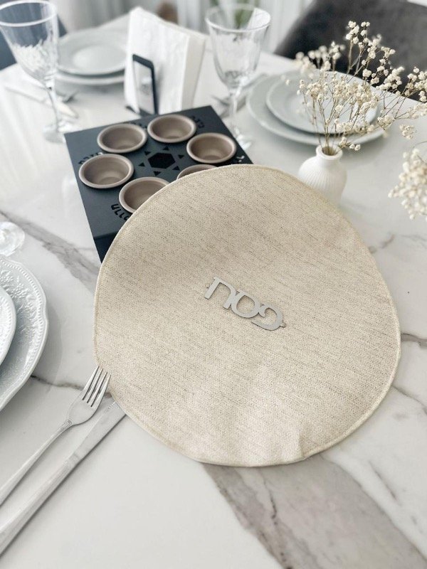 -Mapit redondo 38cm diámetro, cuerina textura símil lino color natural, dorso con 3 capas de Friselina blanca para separar las 3 matzot del seder, deco MATZA en acero inoxidable espejado